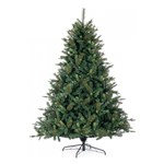 Struttura dei rami e base in metallo. Materiale degli aghi pe stampato ad iniezione e pvc. Rami effetto spazzola che riproducono la struttura degli aghi di pino. Apertura facilitata ad ombrello. Cartone effetto legno con etichetta colorata