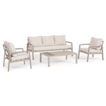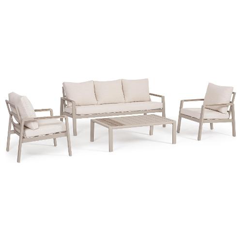 Struttura in alluminio, verniciato a polvere (Poliestere). Braccioli e piano tavolino con inserti in Polywood. Cuscini sfoderabili con tessuto idrorepellente Spun poly (Poliestere)