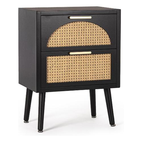 Struttura in MDF, piano e schienale in MDF. Cassetti in MDF con inserti in Rattan. Gambe in legno di pino. Finitura a base di nitrocellulosa. Maniglie in acciaio