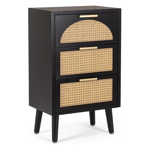Struttura in MDF, piano e schienale in MDF. Cassetti in MDF con inserti in Rattan. Gambe in legno di pino. Finitura a base di nitrocellulosa. Maniglie in acciaio