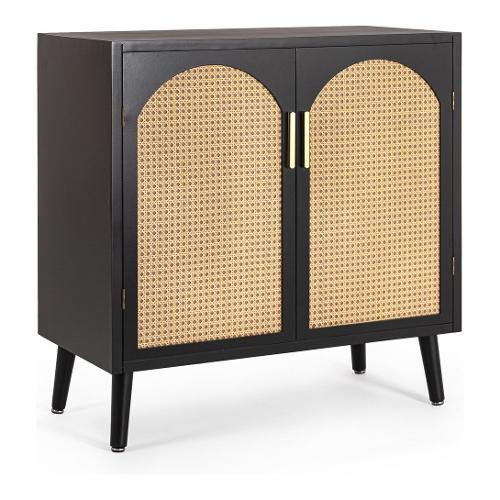 Struttura in legno di pino, piano e schienale in MDF. Ante in MDF con inserti in Rattan. Gambe in legno di pino. Finitura a base di nitrocellulosa. Maniglie in acciaio