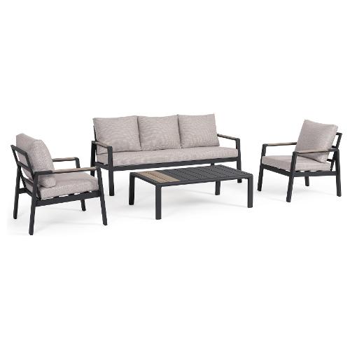Struttura in alluminio, verniciato a polvere (Poliestere). Braccioli e piano tavolino con inserti in Polywood. Cuscini sfoderabili con tessuto idrorepellente Spun poly (Poliestere)
