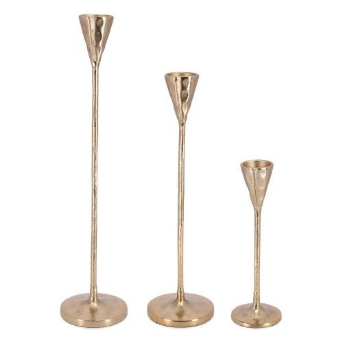 Alluminio lavorato artigianalmente, finitura oro. Solo per uso decorativo. Prodotto fatto a mano. Eventuali variazioni di colore, tonalità o imperfezioni sono da considerarsi una caratteristica di unicità. Ø9,5x31h; ø13x46h; ø13x58h