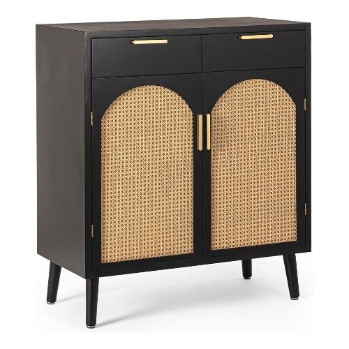 Struttura in legno di pino, piano e schienale in MDF. Ante e cassetti in MDF con inserti in Rattan. Gambe in legno di pino. Finitura a base di nitrocellulosa. Maniglie in acciaio