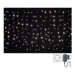 Tenda 400led, luce fredda, dimensione led 5mm. Filo trasparente, misura 4x1mt, lunghezza totale 7mt, lunghezza cavo di alimentazione 3mt, lunghezza filo luci 4mt, distanza led 10cm, distanza tra i fili luce 10cm. Dotato di presa schuko. 8 giochi luce con memory. Per uso interno-esterno ip44. Con colour box. Con trasformatore 31v3.6w.