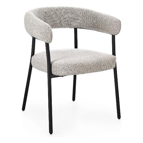 Struttura in compensato. Gambe in acciaio verniciato a polvere. Imbottitura in schiuma poliuretanica densità 22 kg/m3. Rivestimento in Poliestere effetto bouclé