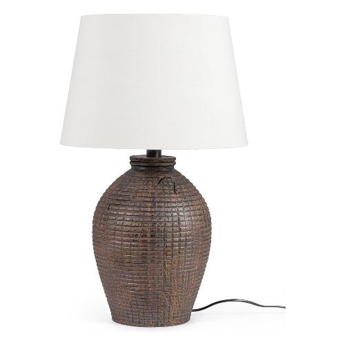 Legno di teak riciclato, finitura ebanizzata. Paralume in Cotone. Base in acciaio. Forma e misura sono indicativi. Tutti i prodotti saranno diversi l'uno dall'altro. Lunghezza cavo: 1,9 m. Distanza tra lampada e interruttore: 34 cm
