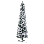 Albero slim innevato. Struttura dei rami e base in metallo. Materiale degli aghi pvc. Apertura facilitata ad ombrello. Cartone effetto legno con etichetta colorata