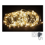 Catena 300 microled ad alta luminosita', luce classic, lunghezza totale filo 33mt, lunghezza cavo di alimentazione 0,3m, lunghezza filo luci 30mt, distanza led 10cm. Dotato di presa schuko. Per uso interno-esterno ip44. Con trasformatore 12v/9w