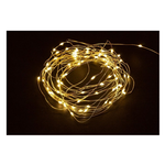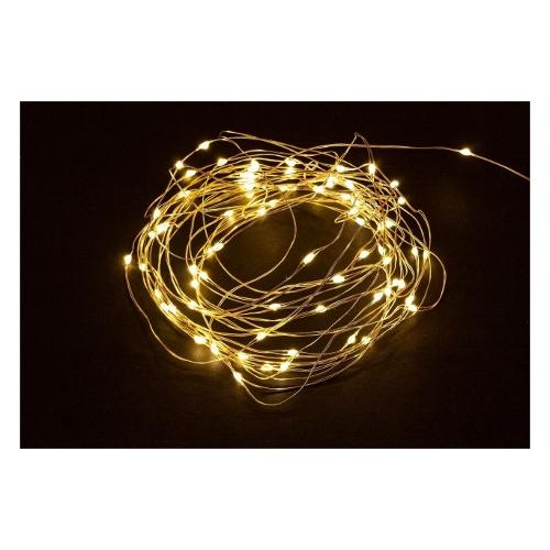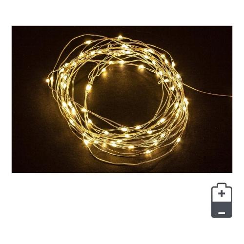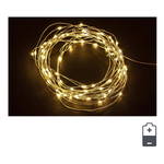 Catena 80 microled, luce classic, lunghezza totale filo 8,20mt, lunghezza cavo di alimentazione 0,3m, lunghezza filo luci 7,90mt, distanza led 10cm. Per uso interno ip20. Con pvc box. Funziona a batteria 3xaa non incluse