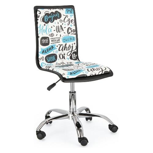 Base in acciaio cromato Ø 60 cm. Ruote in plastica (nylon). Seduta in laminato imbottita in schiuma poliuretanica densità 30kg/m3. Rivestimento in similpelle stampata. Regolabile in altezza con sistema a gas