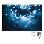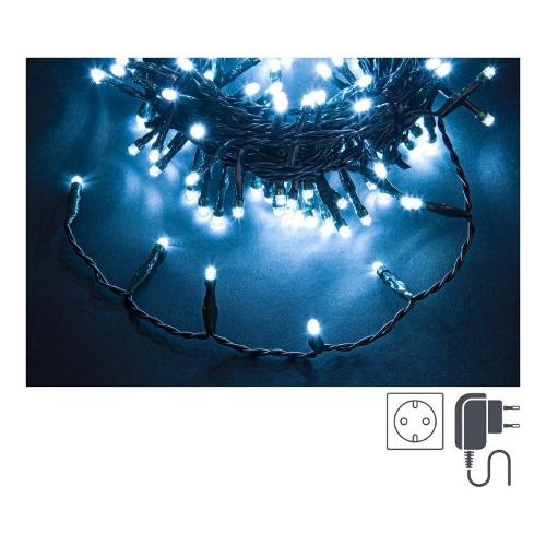 Catena 1000led, luce bianca, dimensione led 5mm non sostituibile. Filo verde, lunghezza totale filo 53mt, lunghezza cavo alimentazione 3mt, lunghezza filo luci 50mt, distanza led 5cm. Dotato di presa schuko. 8 giochi luce con memory. Per uso interno-esterno ip44. Con colour box. Con trasformatore 31v 7.2w