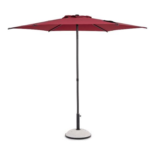 Struttura in acciaio trattato per esterno tramite fosfatazione verniciato a polvere (Poliestere). Palo Ø 38 mm con snodo, 6 stecche 12x18 mm. Telo color burgundy in Poliestere 180 gr/mq con camino antivento. Apertura a spinta manuale. Base non inclusa
