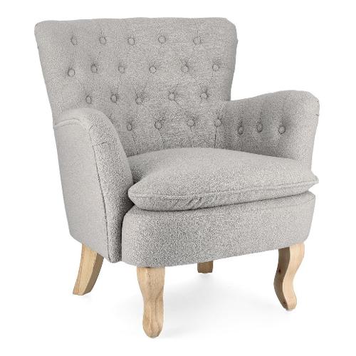 Struttura in legno di pino e compensato, rivestimento in Poliestere effetto bouclé, capitonne'. Densità imbottitura in schiuma poliuretanica seduta 25kg/m3, schienale 20kg/m3 da montare