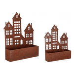 Acciaio. L'acciaio non è verniciato ma naturalmente ossidato, il che vuol dire che il colore dell'articolo si modifica naturalmente a contatto con acqua e altri agenti atmosferici creando un effetto ruggine autentico. Solo per uso esterno. 30,5x8x40h; 40,5x11x53h