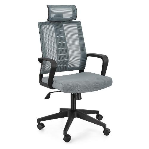 Base in nylon Ø 62. 5 cm. Ruote in plastica (pu). Seduta imbottita in schiuma poliuretanica e rivestita in tessuto a rete Poliestere 100%. Schienale e poggiatesta in plastica (pp) rivestito in tessuto a rete Poliestere 100% con supporto lombare. Altezza regolabile
