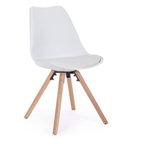 Gambe in legno di faggio. Seduta e schienale in plastica (pp). Cuscino della seduta in similpelle