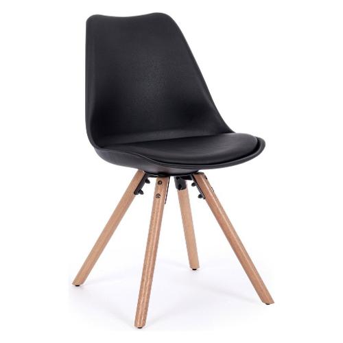 Gambe in legno di faggio. Seduta e schienale in plastica (pp). Cuscino della seduta in similpelle