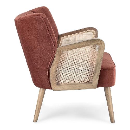 Struttura in legno di pino e compensato. Gambe in Rubberwood. Braccioli con inserti in Rattan. Rivestimento in Poliestere. Densità imbottitura in schiuma poliuretanica 24 kg/m3. Non sfoderabile