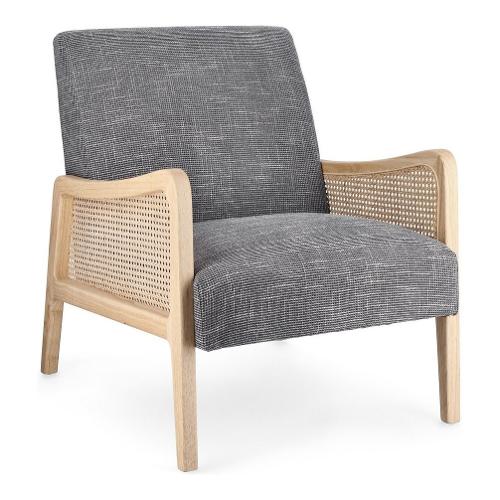Struttura in legno di pino e compensato. Gambe in Rubberwood. Braccioli con inserti in Rattan. Rivestimento in Poliestere. Densità imbottitura in schiuma poliuretanica 24 kg/m3. Non sfoderabile