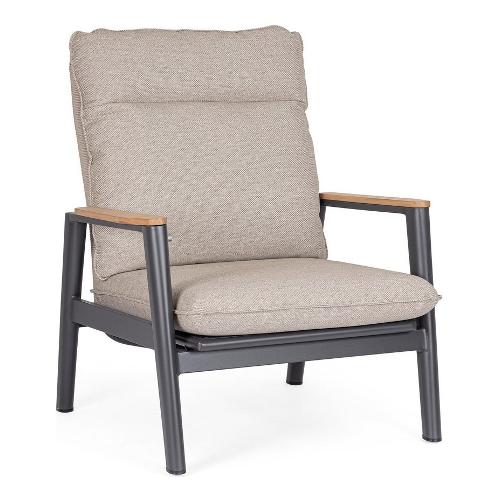 Struttura in alluminio verniciata a polvere (Poliestere). Braccioli con inserti in teak. Schienale (con intreccio in corda Olefin) ,reclinabile in libera posizione e seduta in Textilene 1x1. Cuscini sfoderabili con tessuto idrorepellente Olefin (100% Polipropilene). Viteria in acciaio inossidabile. Schienale da inserire. Non vendibile in germania, austria, svizzera, paesi bassi e lussemburgo
