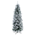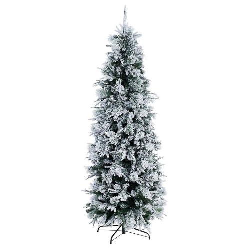Albero slim innevato. Struttura dei rami e base in metallo. Materiale degli aghi pe stampato ad iniezione e pvc. Rami effetto spazzola che riproducono la struttura degli aghi di pino. Apertura facilitata ad ombrello