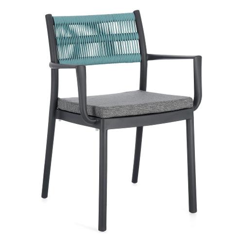 Polipropilene (pp), resistente ai raggi uv. Schienale con intreccio in corda di Poliestere. Cuscino seduta sfoderabile con tessuto idrorepellente Poliestere