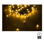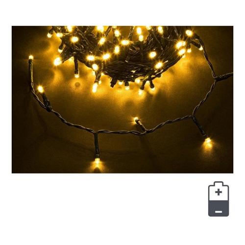 Catena 96led, luce classic, dimensione led 5mm non sostituibili. Filo verde. Lunghezza totale filo 5,05mt, lunghezza cavo alimentazione 0,3mt, lunghezza filo luci 4,75mt, distanza led 5cm. 8 giochi luce con memory. Timer on-off 6/18 ore. Per uso interno-esterno ip44. Con colour box. Funziona a batteria 3xaa non incluse.