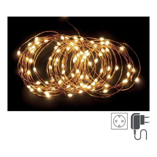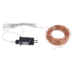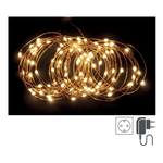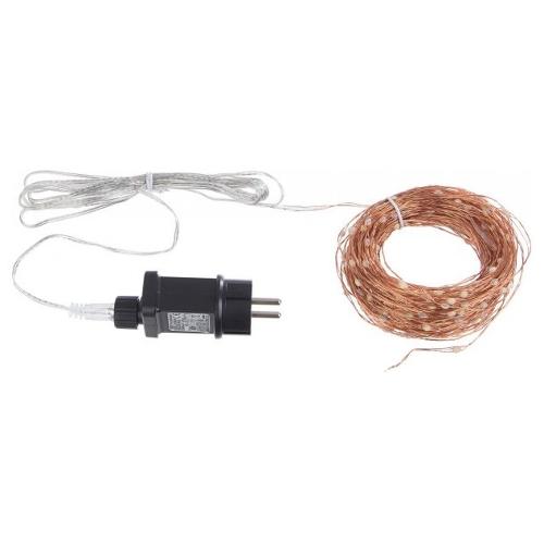Catena 300 microled ad alta luminosita', luce classic, filo copper, lunghezza totale filo 33mt, lunghezza cavo di alimentazione 3m, lunghezza filo luci 30mt, distanza led 10cm. Dotato di presa schuko. 8 giochi luce. Per uso interno-esterno ip44. Con trasformatore 12v/9w.