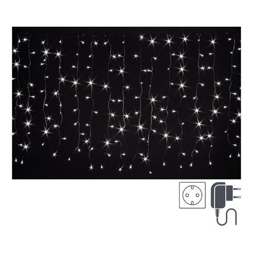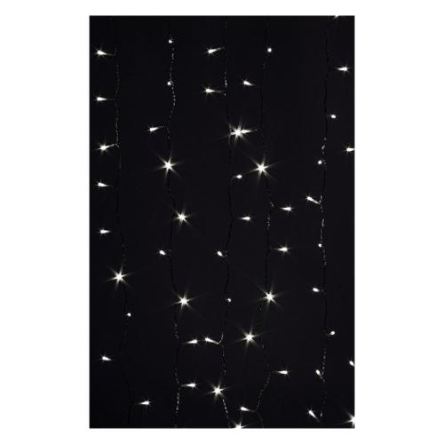 Tenda 400led, luce bianca, dimensione led 5mm. Filo trasparente, misura 2x2mt, lunghezza totale 5mt, lunghezza cavo di alimentazione 3mt, lunghezza filo luci 2mt, distanza led 10cm, distanza tra i fili luce 10cm. Dotato di presa schuko. 8 giochi luce con memory. Per uso interno-esterno ip44. Con colour box. Con trasformatore 31v3.6w.