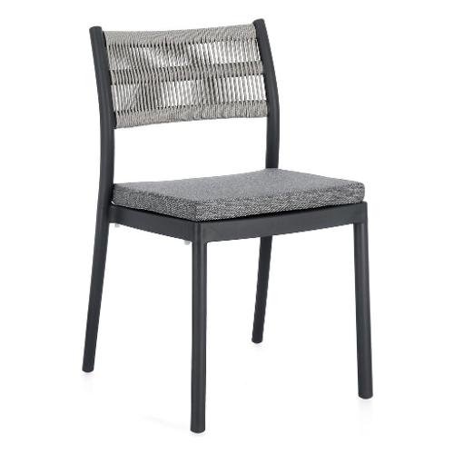 Polipropilene (pp), resistente ai raggi uv. Schienale con intreccio in corda di Poliestere. Cuscino seduta sfoderabile con tessuto idrorepellente Poliestere