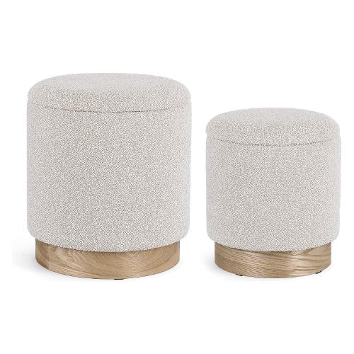 Struttura in MDF e compensato. Fondo con anello decorativo in legno di frassino. Rivestimento in Poliestere effetto bouclé. Anello in legno