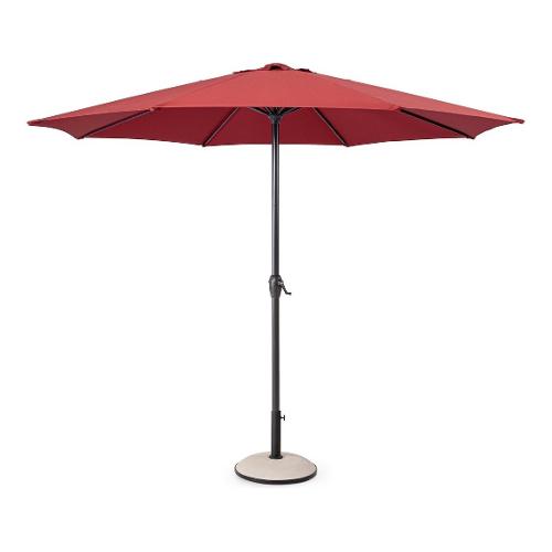 Struttura verniciata a polvere (Poliestere). Palo in alluminio Ø 46/48 mm. 8 stecche in acciaio trattato per esterno tramite fosfatazione 12x18 mm. Telo in Poliestere burgundy 180 gr/mq con camino antivento. Base non inclusa