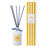La fragranza scelta viene diffusa in modo naturale attraverso i bastoncini, che, immersi nel liquido, la assorbono e la rilasciano gradualmente nell’aria. Il diffusore a bastoncini è progettato per rilasciare le essenze selezionate in modo costante e delicato. La bottiglia in vetro, in formato da 250 ml, elegantemente verniciata di bianco opaco, è impreziosita come per la confezione da righe colorate ispirate ai classici lidi balneari, mentre il bastoncino in fibra blu richiama le sfumature del mare. Un fiocco a righe bianche e blu aggiunge un tocco raffinato, evocando il fascino della stagione più attesa dell’anno. Una volta terminata la fragranza, è possibile ricaricare il diffusore con gli appositi refill, per continuare a godere della freschezza della linea Vacanze Italiane.
