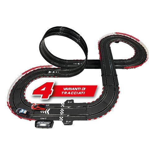 Pista elettrica con 4 possibili tracciati, con dotazione 2 auto 1:43 alfa romeo giulia quadrifoglio carabinieri e bugatti con luci e funzione turbo. Include parti di ricambio e alimentatore rete domestica
