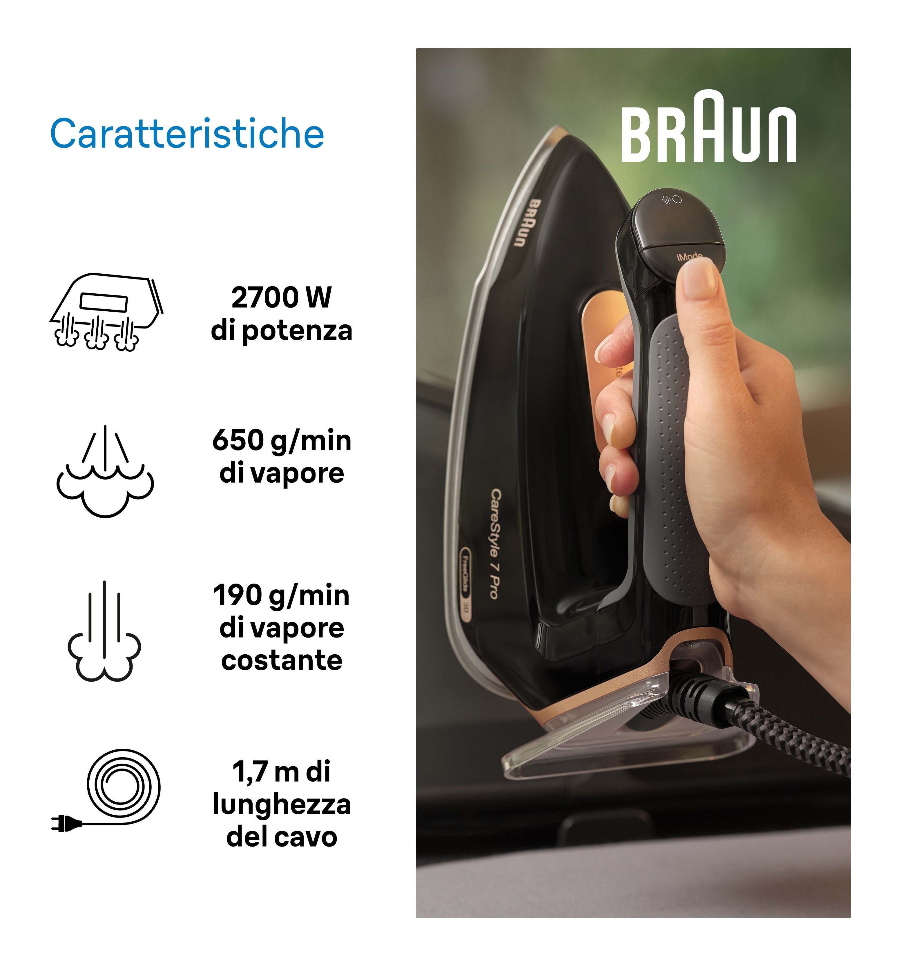 Il nuovo CareStyle 7 Pro è il sistema di stirante più potente, in grado di erogare fino a 190 g/min di vapore continuo grazie all'innovativa tecnologia PowerSteam. Scopri una qualità di stiratura superiore e funzioni innovative che ti permetteranno di avere la meglio sui tessuti più difficili e le pieghe più ostinate. Ottieni risultati di stiratura professionali in tutta comodità e senza sforzi, grazie allo speciale design ergonomico dell'impugnatura del primo ferro da stiro al mondo con certificazione ergonomica