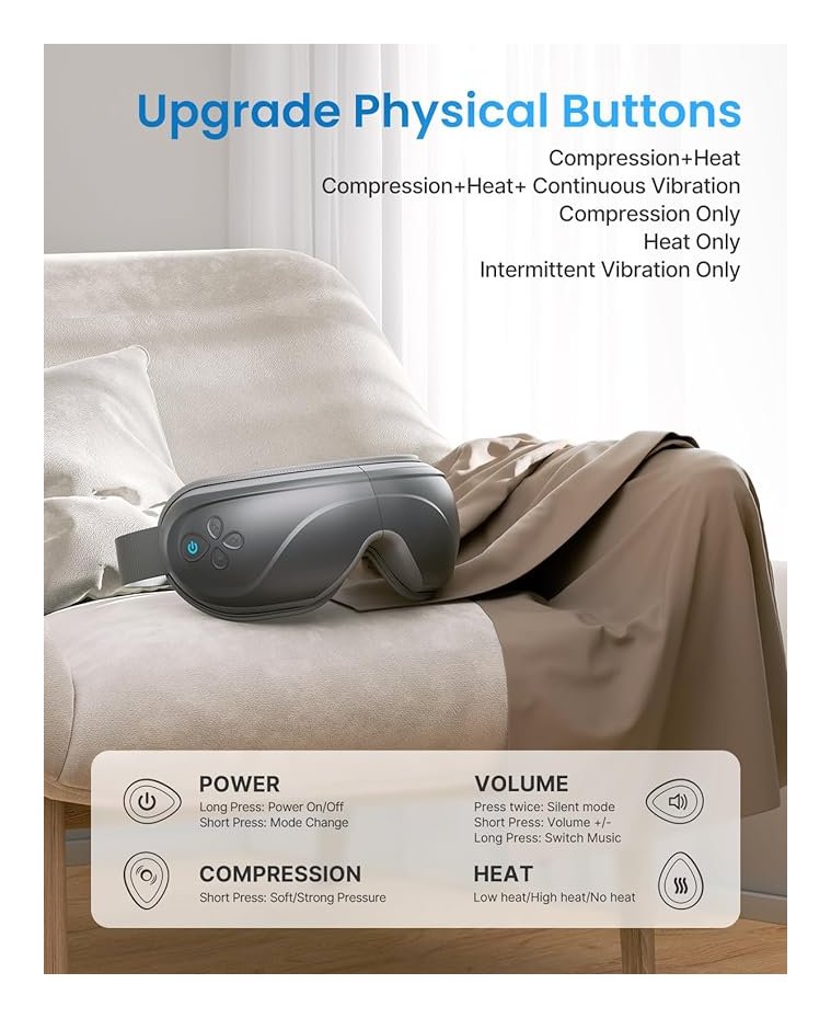Il massaggio impastante combinato con compressione e vibrazione lascerà i tuoi occhi rinfrescati e ringiovaniti. Hai bisogno di un po' di calore extra per i tuoi occhi stanchi? Scegli tra due diverse impostazioni di calore per aiutare a combattere gonfiore e secchezza, offrendo un sollievo più profondo. E con la connettività Bluetooth , puoi ascoltare la tua musica preferita mentre ti godi un massaggio.
