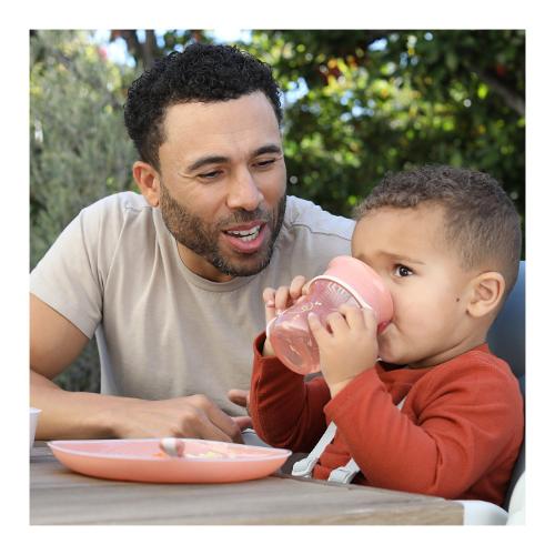 Tazza ergonomica e dotata di manici rimovibili, è progettata per i bambini di 12 mesi che stanno imparando a coordinare respirazione e deglutizione; permette di bere proprio come dal bordo di un bicchiere, in autonomia e senza rovesciare l'acqua. la membra in silicone 360° si attiva con le labbra, rilasciando il liquido quando il labbro del bambino preme contro il bordo. La membrana è trasparente, così il bambino può vedere il liquido avvicinarsi. può essere facilmente rimossa per trasformare la tazza in un vero bicchiere, da utilizzare con o senza manici. Le tazze chicco sono state sviluppate con la collaborazione di esperti logopedisti e pediatri, per guidare in modo semplice e naturale nel passaggio dall'allattamento al bere in autonomia