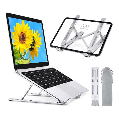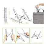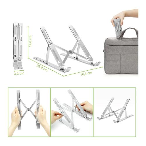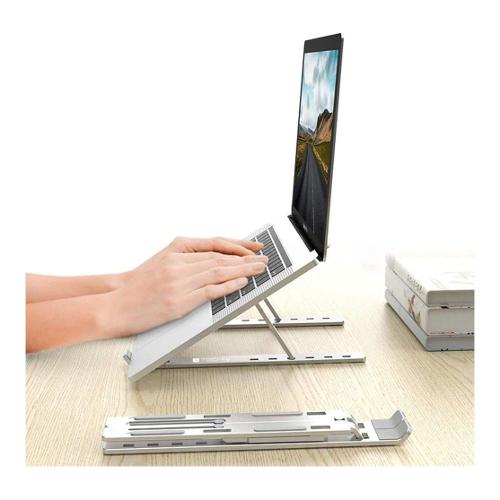 Supporto per laptop ergonomicamente regolabile in 6 livelli di angolazione da 0 a 45° (altezza da 5,5 a 15,5 cm). Si adatta a dispositivi come smartphone, tablet, notebook da 10" a 16" e funge anche da comodo leggio per libri e giornali