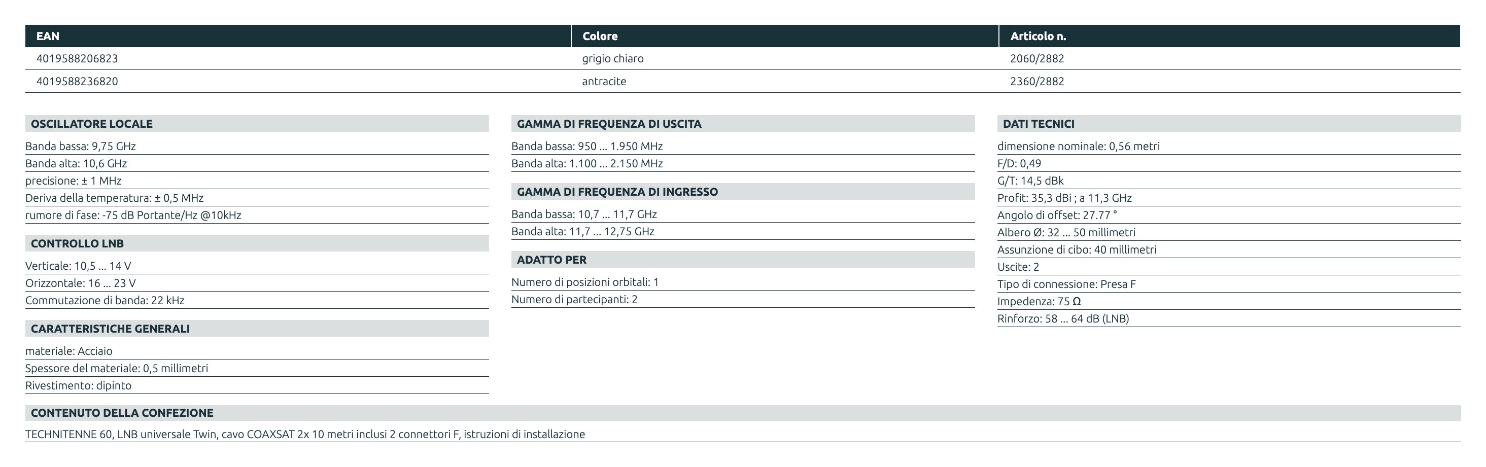 Kit parabola 60 Twin LNB con cavo 10m Grey 2060 2882