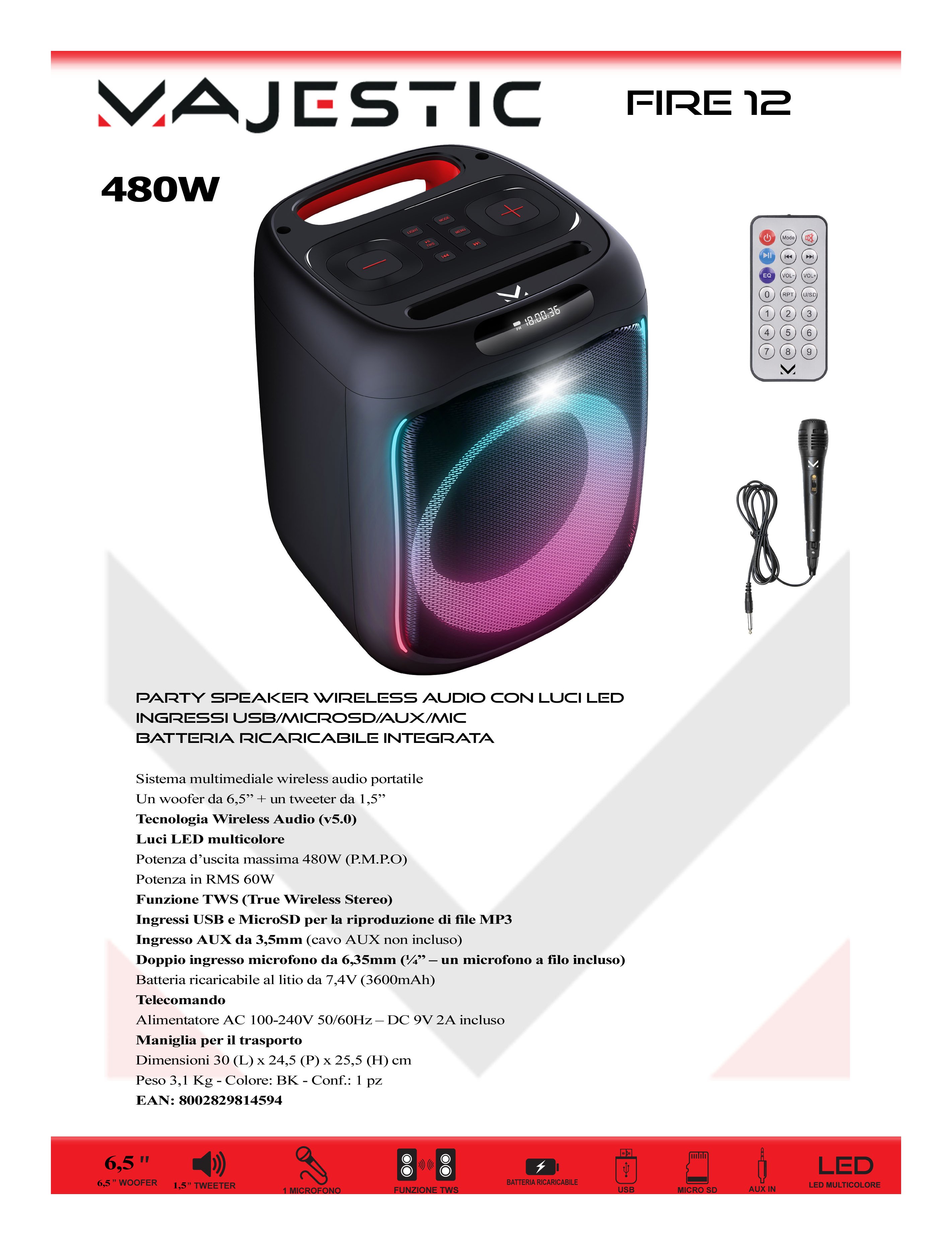 Party speaker wireless audio con luci led multicolori. Microfono a filo incluso.
