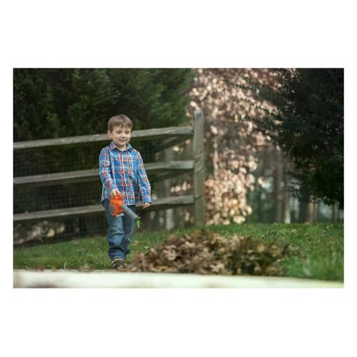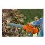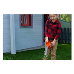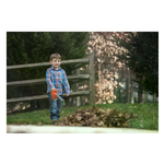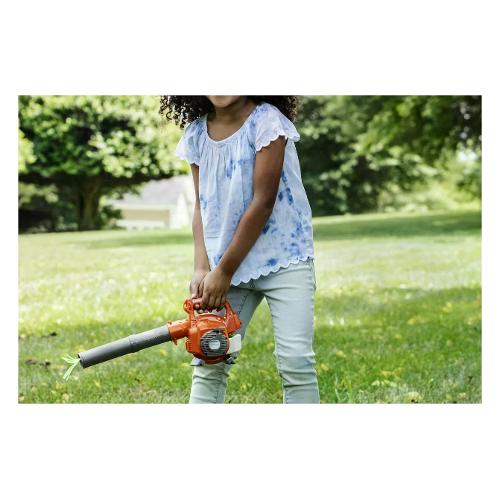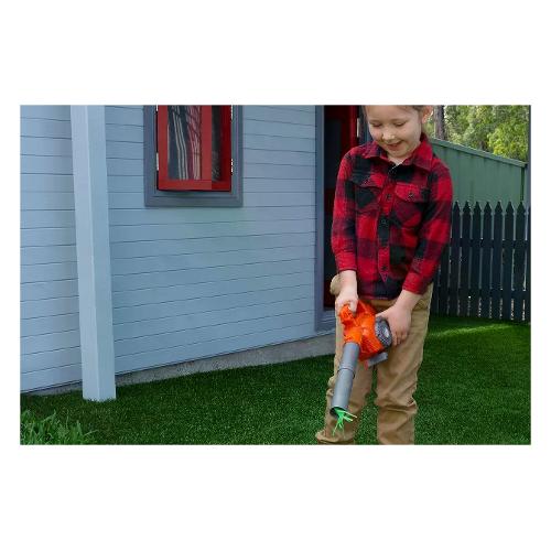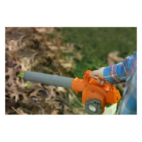 Soffiatore giocattolo. Dal tubo del soffiatore fuoriesce dell'aria come se fosse un vero soffiatore. Completo di suoni realistici