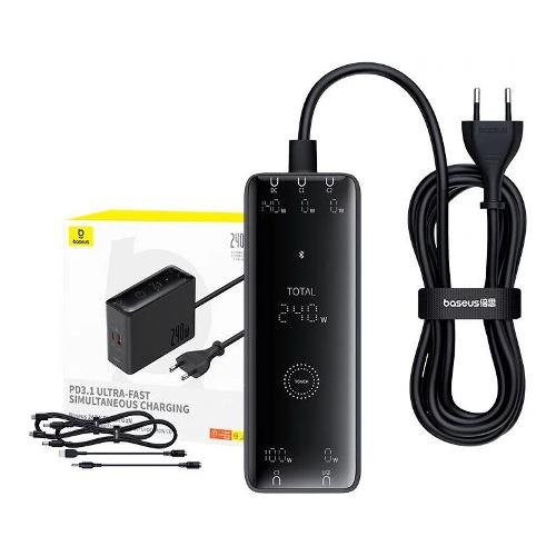 Il caricabatterie Baseus GaN dispone inoltre di più porte di uscita, tra cui porte USB-C e USB-A, in modo da poter caricare una varietà di dispositivi compatibili con queste interfacce. Una porta DC dedicata ai computer portatili rende il dispositivo ancora più versatile. Il kit comprende un caricabatterie e diversi cavi, fornendo una soluzione completa per molte esigenze di ricarica. Il caricabatterie pesa circa 600 g e ha un ingresso CA di 110-240 V ~ 50/60 Hz, con un'uscita CC di 20 V -12 A (240 W), che lo rende comodo da usare e da trasportare, nonostante la sua enorme potenza, e affidabile in qualsiasi situazione!