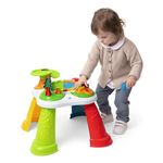 2 configurazioni: tavolo e quando il bambino è ancora troppo giovane per stare in piedi da solo, le gambe possono essere rimosse e il tavolo diventa un pannello di attività per giocare in sicurezza sul pavimento.