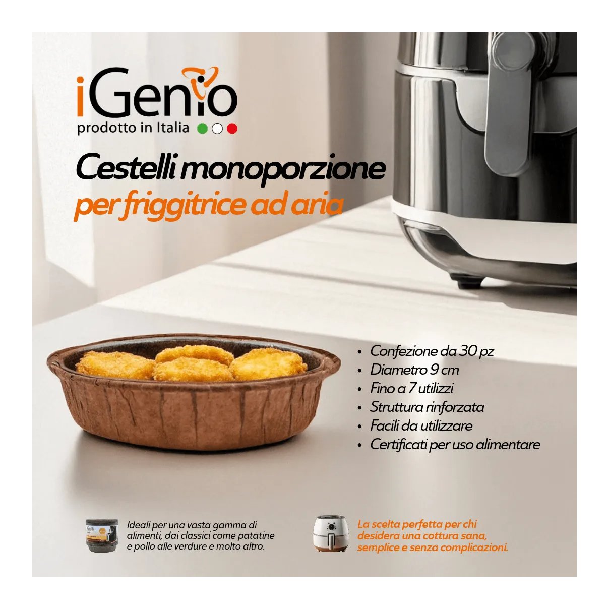 Ottimizza ogni cottura con i cestelli iGenio in carta siliconata avana, ideali per friggitrici ad aria con un diametro di 9 cm o superiore. Realizzati con struttura rinforzata, sono impermeabili, resistenti all’olio e progettati per prevenire l’aderenza dei cibi, semplificando la pulizia e migliorando l’efficienza in cucina. Riutilizzabili fino a 7 volte e resistenti a temperature fino a 230°C, assicurano prestazioni costanti e affidabili ad ogni utilizzo.