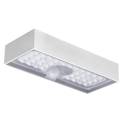 Applique solare con pannello fotovoltaico integrato, sensore crepuscolare e sensore PIR di movimento. Design moderno e lineare che garantisce un’illuminazione versatile. Singola emissione