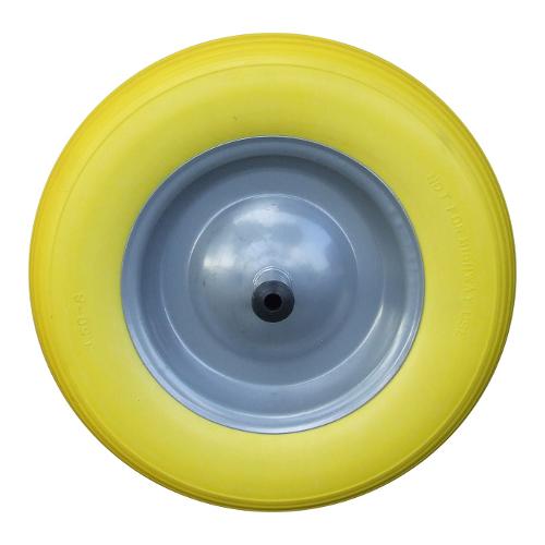 Ruota di ricambio piena per carriola, in poliuretano. Flange in acciaio stampato elettro-saldato verniciato grigio. Mozzo su gabbia a rulli. Ruota antiforatura.