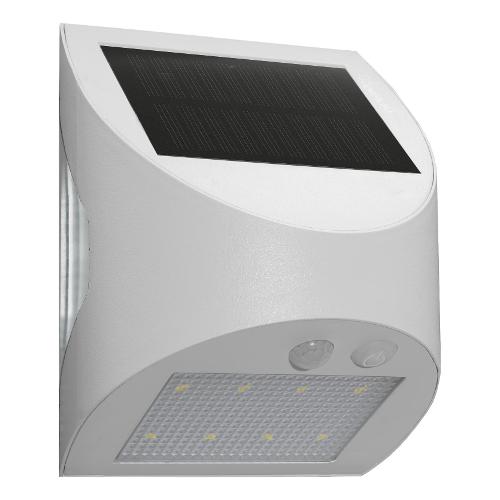 Applique solare a doppia emissione luminosa con pannello fotovoltaico integrato. Ottima soluzione per illuminare giardini, viali e cortili in modo sostenibile, a costo zero; ideale per zone non coperte da rete elettrica. Rapida installazione