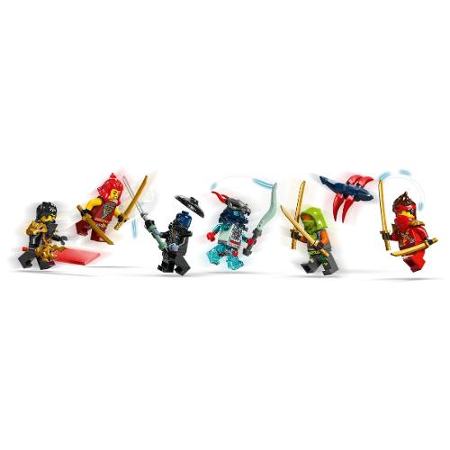 Questo set di gioco del veicolo lego® contiene 6 minifigure: kai, wyldfyre e, per la prima volta, frak, ciascuno con 2 spade katana dorate, cole con una lama rivelatrice traslucida e nokt e uno scout dragoniano spettrale, ciascuno con una spada, più un veicolo aliante e un animaletto. Il duo malvagio ha anche uno stendardo con un messaggio segreto che può esseredecodificato solo con la spada rivelatrice traslucida di Cole.