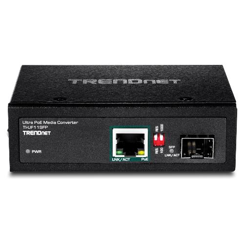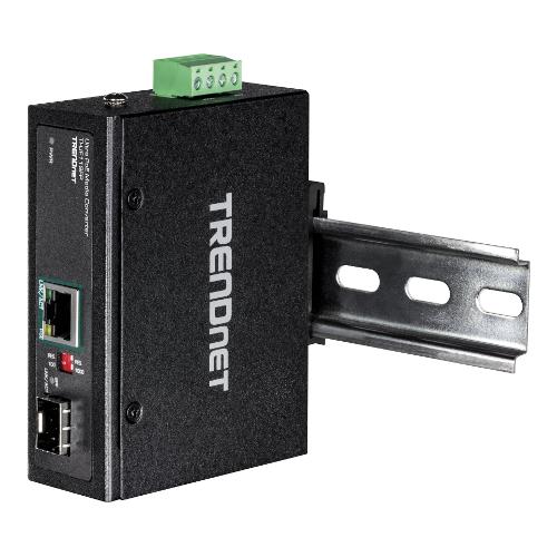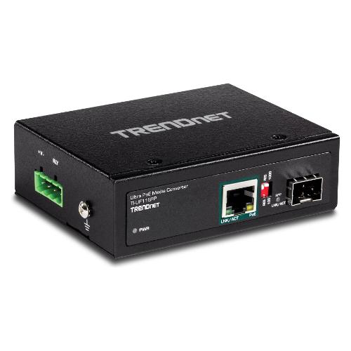 SFP Industriale di TRENDnet per Convertitore Media UPoE Gigabit, modello TI-UF11SFP, converte da fibra a rame fornendo alimentazione per dispositivi compatibili PoE, PoE+ e UPoE come telecamere IP, telefoni VoIP e punti d'accesso wireless. L'alloggiamento temprato classificato IP30 è adatto per ambienti lavorativi industriali. Doppi ingressi di alimentazione ridondanti (presa d'alimentazione venduta separatamente: TI-S15052, TI-S15052, TI-S12048) con protezione dalla corrente di sovraccarico che minimizza i tempi d'inattività. Alimentatore venduto separatamente (modelli: TI-S15052, TI-S15052, TI-S12048)
